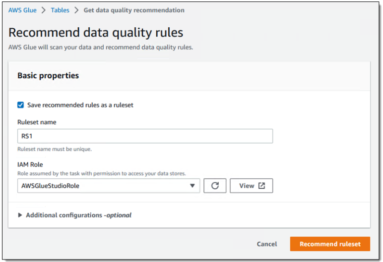 然后我为我的规则集 ( RS1 ) 输入一个名称,选择一个有权访问它的 IAM 角色,然后单击推荐规则集: