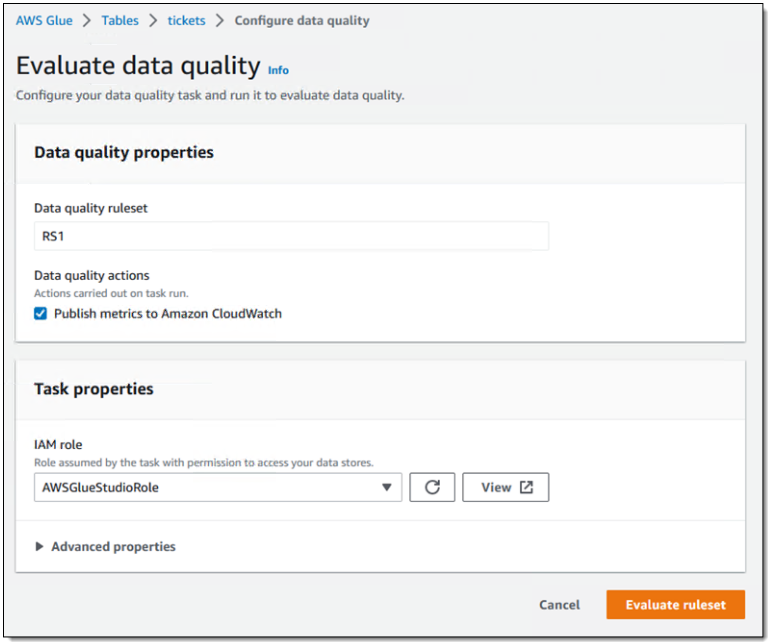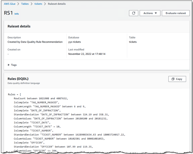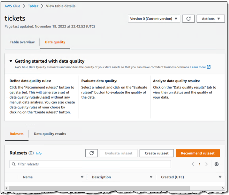 我可以在我的一个 Glue 表上打开新的数据质量选项卡来开始。从那里我可以手动创建一个规则集,或者我可以单击推荐规则集开始:
