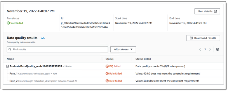 对于这篇博文,我制定了比必要更严格的规则,以便我可以向您展示当数据质量评估失败时会发生什么。