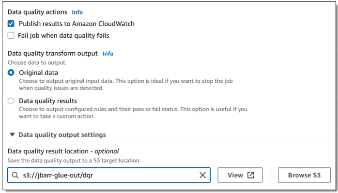 我可以设置作业选项,并选择原始数据或数据质量结果作为转换的输出。我还可以将数据质量结果写入 S3 存储桶: