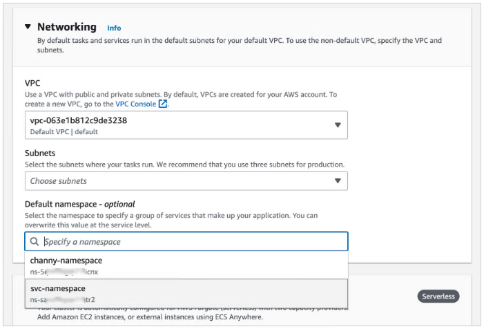 创建 ECS 集群时,您可以在Networking设置的Default namespaces中选择其中一个命名空间。为在AWS Fargate和Amazon EC2实例中运行的所有新 ECS 服务启用 ECS Service Connect 。要启用所有现有服务,您需要使用新版本的 ECS 优化的 Amazon 系统映像 (AMI) 或支持 ECS Service Connect 的新 Fargate 代理重新部署。