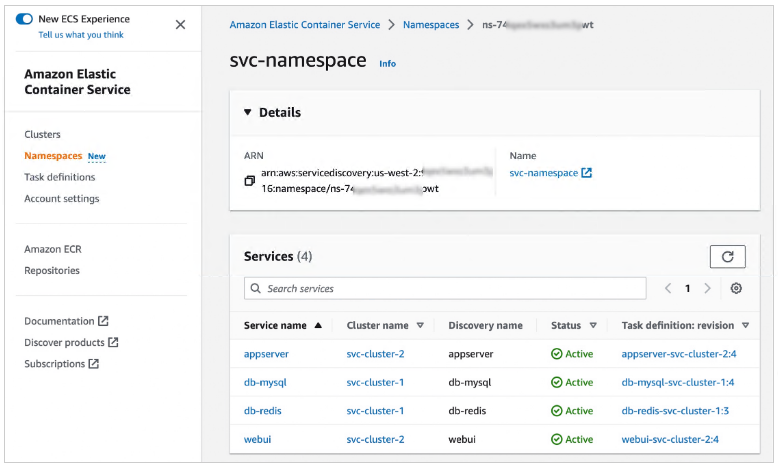 您还可以在 Amazon ECS 控制台左侧导航窗格中的命名空间中查看 Cloud Map 命名空间列表。当您选择一个命名空间时,它会显示来自两个不同 ECS 集群的具有相同命名空间的服务列表,其中包含数据库服务 ( db-mysql, db-redis) 和后端服务 ( webui, appserver)。