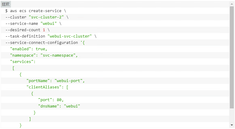 接下来,让我们使用调用的现有任务定义创建一个服务, webui-svc-cluster 并使用 ECS Service Connect 公开您的 Web 用户界面服务器。要使用 Service Connect,您需要在任务定义中添加端口名称。对于以下命令,端口名称 webui-port 在任务定义中。