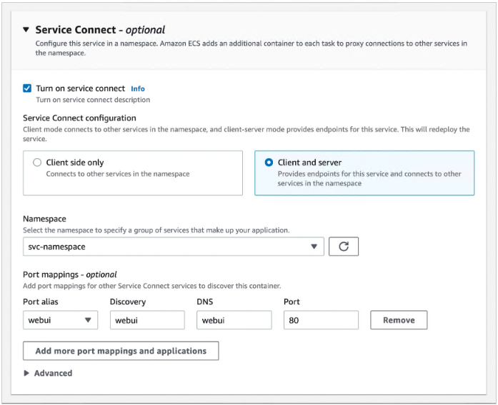 在此命令中,portName表示对容器端口的引用,并clientAliases分配端口号和 DNS 名称,覆盖端点中使用的发现名称。每个服务都有一个端点 URL,其中包含协议、DNS 名称和端口。您可以在任务定义或 ECS 服务配置中选择协议和端口名称。例如,端点可以是http://webui:80、grpc://appserver:8080或http://db-redis:8888。