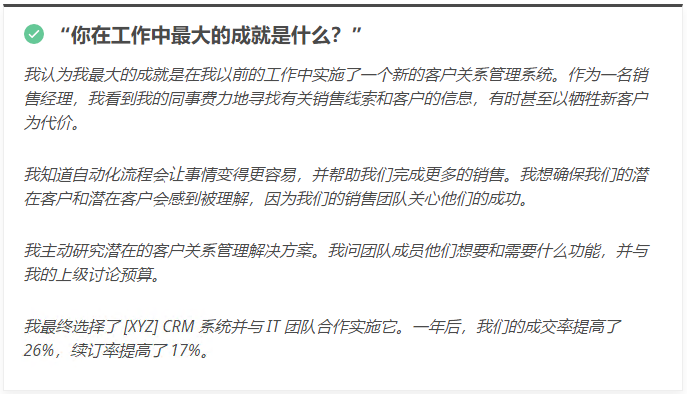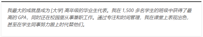 选择与您的职业或学术生活相关的答案。尽可能将成就与职位所需的关键技能联系起来。如果您有多项重大成就,请选择一项能够为公司展示可衡量结果的成就。