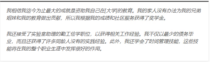 如果您没有太多可以借鉴的专业经验,请考虑您学术生涯中的成就以及您所做的任何实习或志愿者工作。