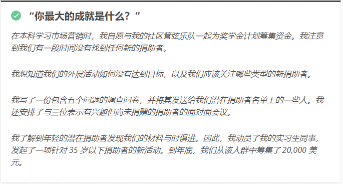 像这样的志愿者工作是入门级候选人“最大成就”答案的理想来源。这是与职业相关的并且具有美元价值。如果那不可能——在这个层面上通常不是这样——你仍然可以选择影响他人的东西。