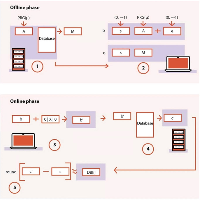 这就是 FrodoPIR 介入的地方。它涉及两个阶段,一个离线准备步骤和一个在线步骤,其中客户端将加密查询传输到服务器。