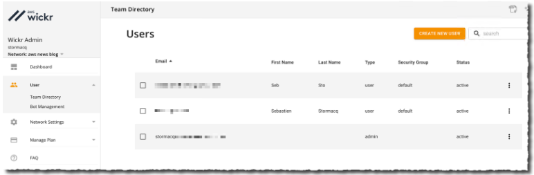 Wickr 管理员管理网络。网络是一组用户及其相关配置,类似于 Slack 工作区。可以手动添加或导入用户。大多数组织将通过现有的身份系统联合用户。Wickr 将联合用户与任何OpenID Connect兼容系统。