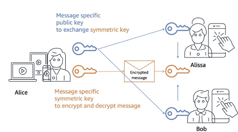 每条消息都有一个唯一的 AES 加密密钥和一个唯一的 ECDH 公钥,用于与其他收件人协商密钥交换。消息内容(文本、文件、音频或视频)在发送设备(例如您的 iPhone)上使用消息特定的 AES 密钥加密。消息特定的 AES 密钥通过Diffie-Hellman椭圆曲线密钥交换 (EDCH521) 机制与接收者交换。这可确保只有预期的收件人拥有消息特定的 AES 密钥来解密消息。