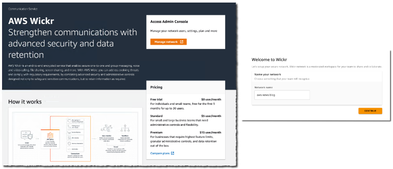 首先,我在 AWS 管理控制台中选择 Wickr。然后,我选择创建网络。我输入网络名称,然后选择Continue。