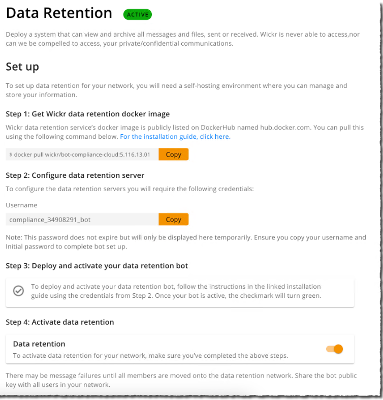 为了尝试这个过程,我遵循了文档。我打开 Wickr 管理页面并在Network Settings下选择Data Retention。
