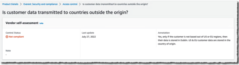 我选择“安全与合规”选项卡,发现我需要请求访问权限才能查看详细的安全与合规信息。我选择右上角的Request access按钮,请求供应商访问他们的合规文档。