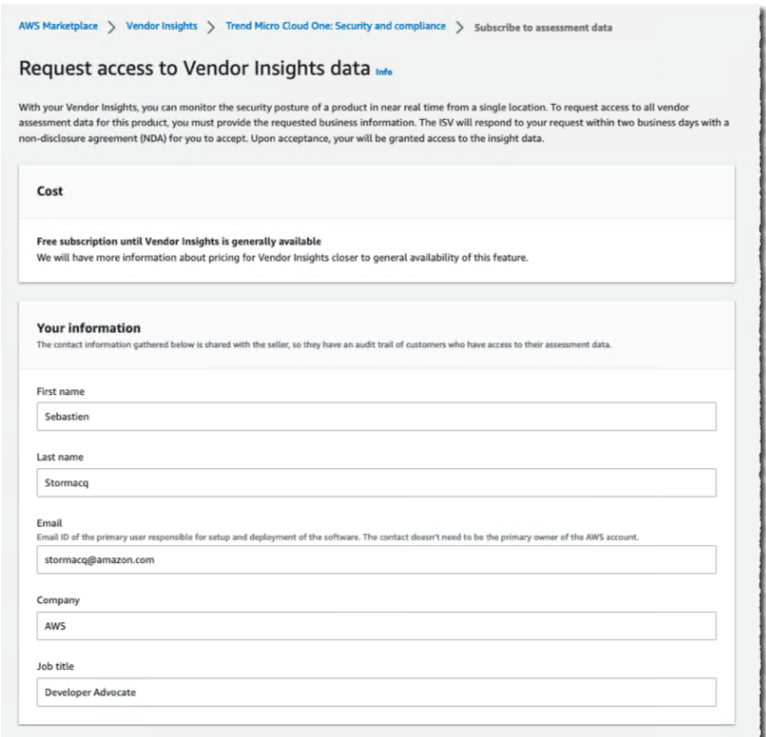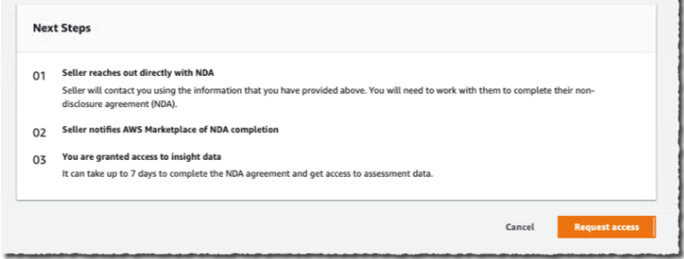 后续步骤部分详细说明了接下来会发生什么。卖方将与我联系以签署保密协议 (NDA)。签署 NDA 后,卖家将通知 AWS Marketplace。然后,我将被授予访问 Vendor Insights 数据的权限。