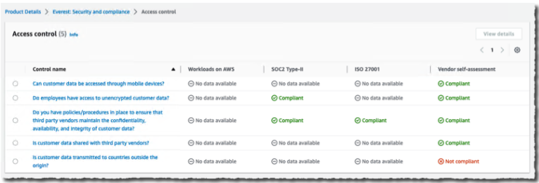 我选择访问控制的详细信息并查看控制名称下的列表。对于它们中的每一个,我都可以看到SOC2 类型 2、ISO 27001和供应商自我评估的合规性。
