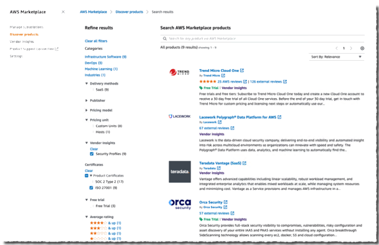 通过搜索和访问 Vendor Insights 配置文件,在 AWS Marketplace 中快速发现符合您的安全和认证标准的产品。