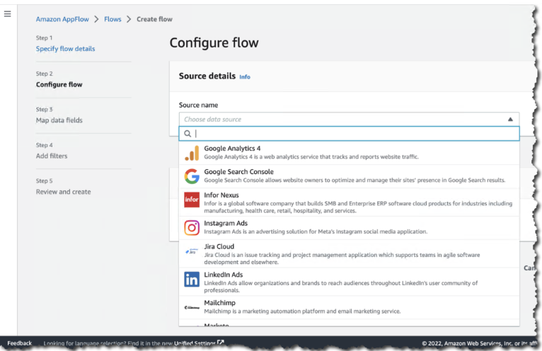 今天,我们很高兴地宣布为 Amazon AppFlow 添加 22 个新的数据连接器,包括:营销连接器(例如,Facebook Ads、Google Ads、Instagram Ads、LinkedIn Ads)。用于客户服务和参与的连接器(例如,MailChimp、Sendgrid、Zendesk Sell or Chat 等)。业务运营(Stripe、QuickBooks Online 和 GitHub)。