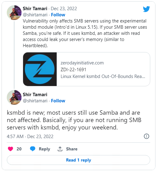 “ksmbd 是新的;大多数用户仍在使用 Samba,不受影响。基本上,如果您没有使用 ksmbd 运行 SMB 服务器,那就好好享受周末吧。” 添加塔玛丽。