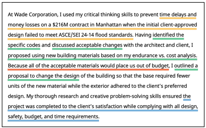 查看土木工程职位的申请人如何在求职信中展示他们批判性思考的能力。我们在与上述信息相匹配的颜色部分下划线,以显示申请人如何添加有关其批判性思维技能的额外细节: