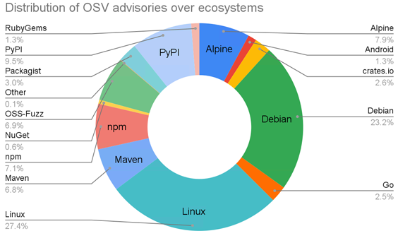 这种扩展的结果是 OSV.dev 是超过 38,000 个安全警报的存储库,高于一年前的 15,000 个安全警报,其中包括 Linux (27.4%)、Debian (23.2%)、PyPI (9.5%)、Alpine (7.9 %) 和 npm (7.1%) 占据了前五名。