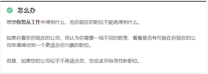 如果你总体上喜欢自己的职业道路,对公司的目标感到投入,并且喜欢你的同事,那么你仍然有希望学会喜欢你的工作(即使现在感觉不喜欢)。
