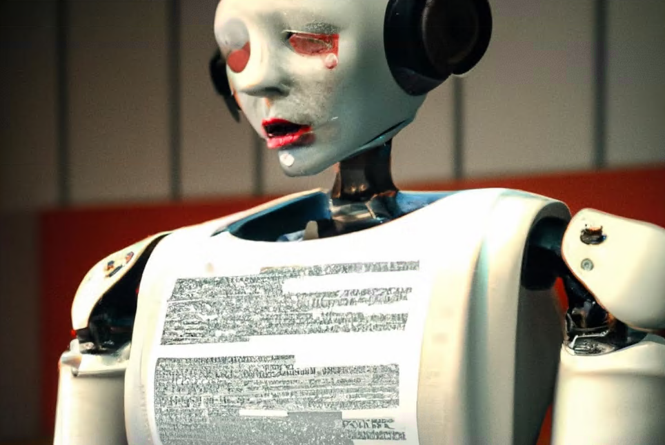 一张由 DALL-E 2 生成的图片,提示为“为了给真正的作家写讣告而编造事实的机器人图片,数字艺术”。 来自 OpenAI 的 DALL-E 2