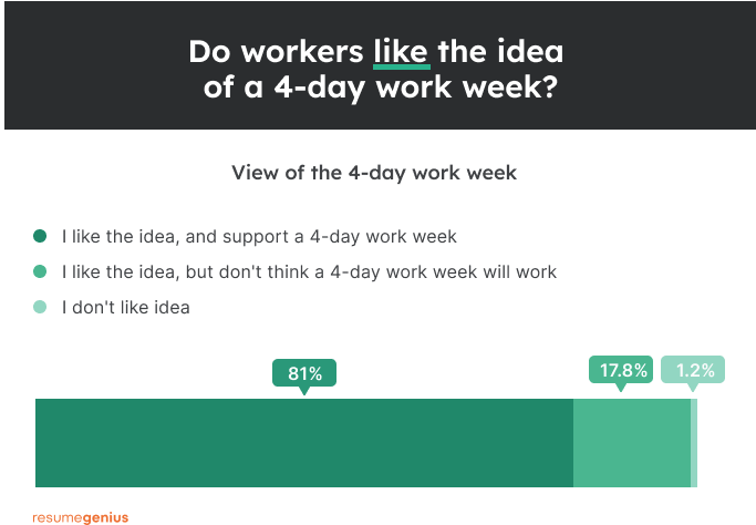 我们调查的大多数工人支持每周工作四天 (81%)。同样,GoodHire 在 2021 年进行的一项调查发现,83% 的员工(在接受调查的 4,000 人中)也支持每周工作四天。