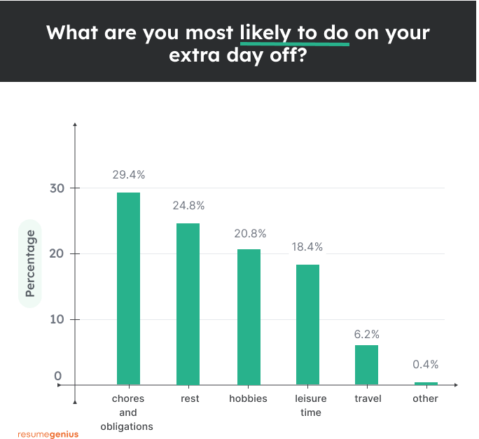 工人将能够参与睡眠、身体活动和心理脱离工作的“恢复体验” 2。不出所料,分别有 25% 和 20% 的员工表示,他们最有可能利用额外的休息日休息和从事业余爱好。
