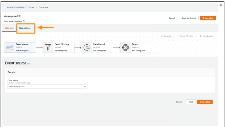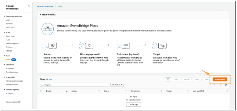 首先,我打开 Amazon EventBridge 控制台。在导航部分,我选择Pipes。然后我选择创建管道。