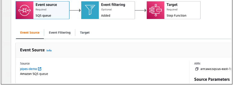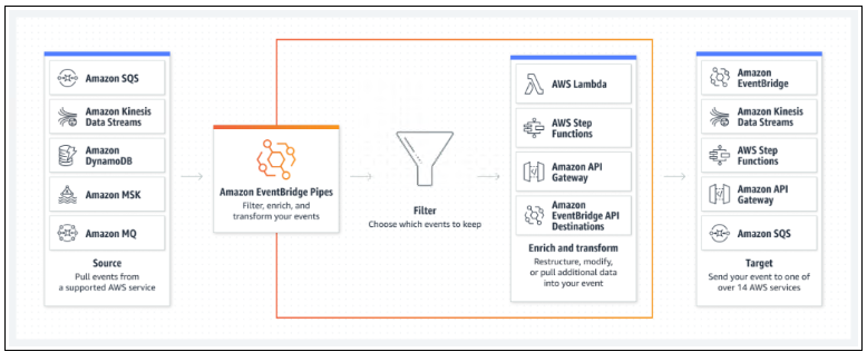 Amazon EventBridge Pipes 带来了Amazon EventBridge Event Bus最受欢迎的功能,例如事件过滤、与超过 14 种 AWS 服务的集成以及自动交付重试。