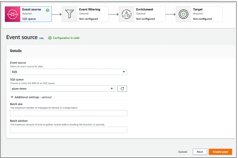 我选择SQS并选择我现有的 SQS 队列。如果我需要进行批处理,我可以选择Additional settings开始定义Batch size和Batch window。然后,我选择下一步。