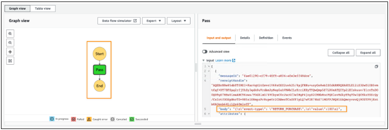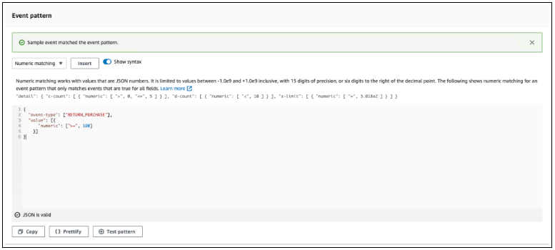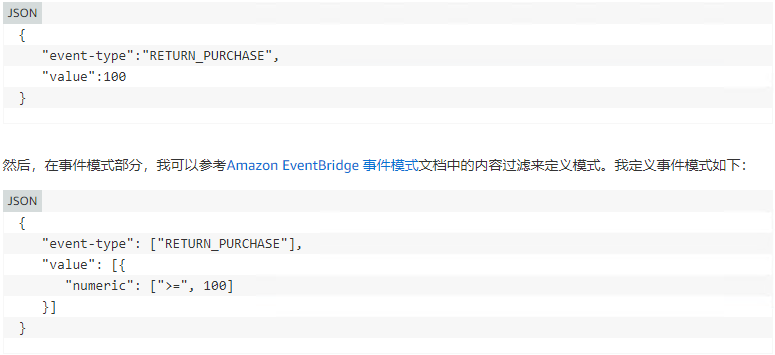 我可以使用 来自 AWS 事件的示例事件 或定义自定义事件。例如,我想处理价值为 100 或更高的已退回购买商品的事件。以下是 JSON 格式的示例事件:
