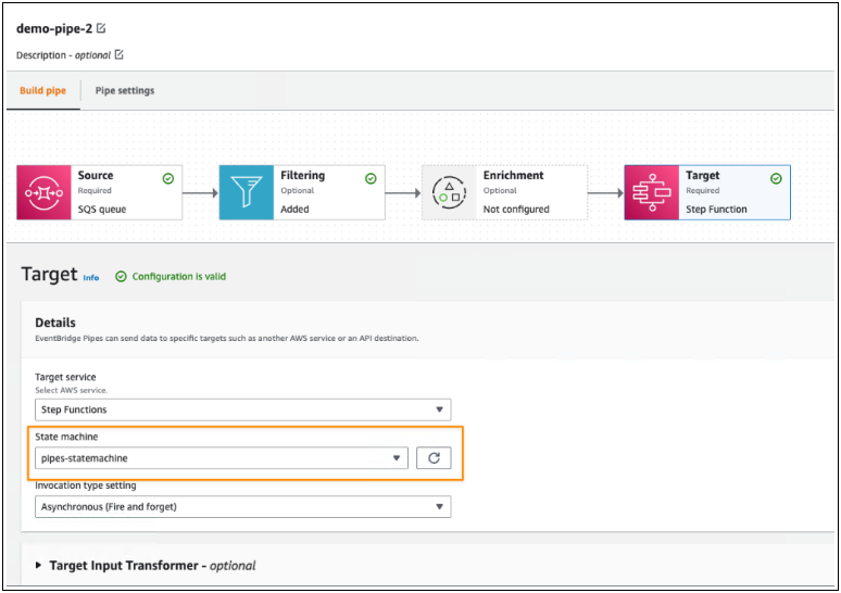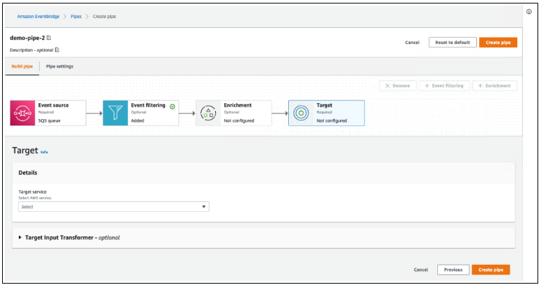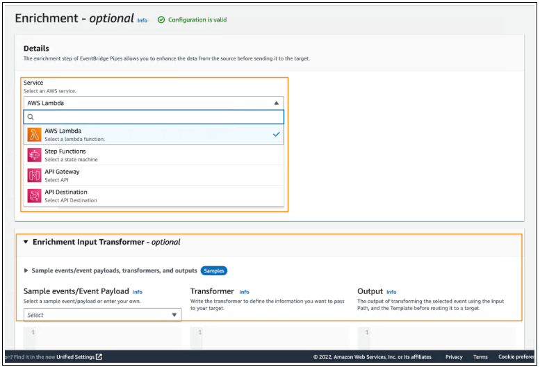 在下一个可选步骤中,我可以使用一个Enrichment来增强、转换或扩展事件,然后再将事件发送到目标位置。当我需要使用现有 AWS Lambda 函数或使用目标 API 的外部 SaaS API 来丰富事件时,这种丰富非常有用。此外,我可以使用Enrichment Input Transformer塑造事件。
