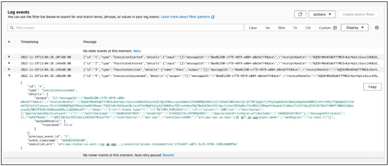要检查 Step Functions 是否成功处理了我的事件,我可以在 Step Functions 中查看我的状态机。在此页面上,我看到我的事件已成功处理。