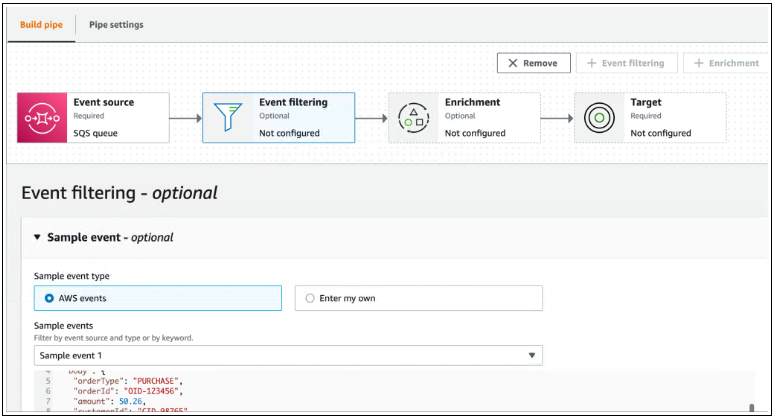 在下一页上,事情变得更加有趣,因为我可以从我刚刚选择的事件源定义事件过滤。此步骤是可选的,但事件过滤功能使我可以轻松处理只需要由我的事件驱动应用程序处理的事件。此外,此事件过滤功能还帮助我提高成本效益,因为此管道不会处理不必要的事件。例如,如果我使用 Step Functions 作为目标,事件过滤将只执行与过滤器匹配的事件。