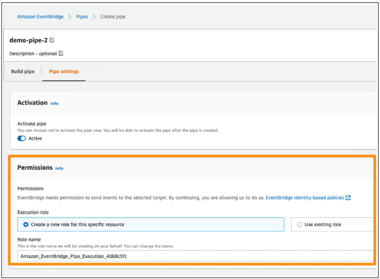 在权限部分,我可以为此管道定义新的 IAM 角色或使用现有角色。为了提高开发者体验,EventBridge Pipes 控制台会帮我算出 IAM 角色,所以我不需要手动配置所需的权限,让 EventBridge Pipes 为 IAM 角色配置最低权限。由于这是我第一次创建管道,因此我选择了 Create a new role for this specific resource。