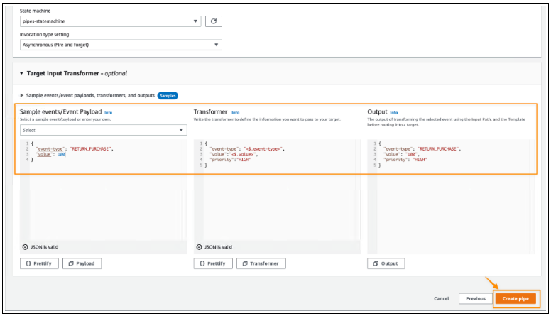 另外,我也可以参考Transforming Amazon EventBridge target input文档使用Target Input Transformer 。对于我的情况,我需要为进入该目标的事件定义高优先级。为此,我在Sample events/Event Payload中定义了一个示例自定义事件,并在Transformer部分添加了: 。然后在输出部分,我可以看到要传递给目标目标服务的最终事件。然后,我选择 创建管道。priorityHIGH