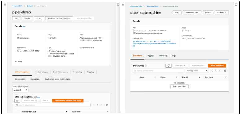 以下屏幕截图是我现有的 Amazon SQS 队列和 AWS Step Functions 状态机。就我而言,我需要为队列中的每个事件运行状态机。为此,我需要将我的 SQS 队列和 Step Functions 状态机与 EventBridge 管道连接起来。