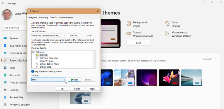 您可以更改的另一个元素是计算机发出的声音。从“主题”页面中选择“声音”以打开一个小窗口,您可以在其中更改各种 Windows 操作和程序的默认声音。您还可以选择听到 Windows 启动声音。