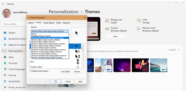 单击鼠标光标打开鼠标属性窗口,您可以在其中为鼠标选择一个新光标。选择每个鼠标状态并单击浏览按钮以查看可用的光标图标。您可以通过单击特定方案来切入正题,以一次性更改所有鼠标光标状态。