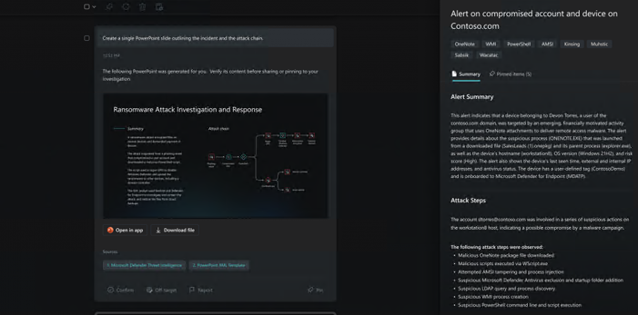 例如,用户可以向 Security Copilot 询问特定时间段内的可疑用户登录情况,甚至可以使用它来创建概述事件及其攻击链的 PowerPoint 演示文稿。它还可以接受文件、URL 和代码片段进行分析。