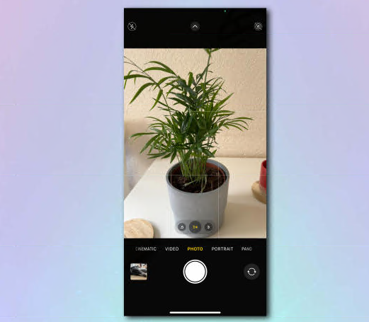 iPhone 相机屏幕的屏幕截图:框架中是花盆中的植物,在白色厨房桌子上