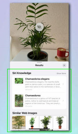 查找结果现在将在屏幕底部弹出。轻点 Siri Knowledge 条目以阅读更多信息,或轻点类似 Web 图像以查看更多图像并检查您的 iPhone 是否找到了正确的植物。