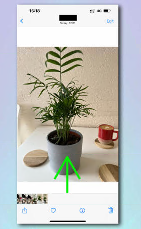 iPhone 照片应用程序中的一张图片的屏幕截图,其中有一个绿色箭头,表示用户需要向上滑动