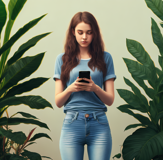 手持 iPhone 拍摄植物靠在砖墙和蓝色大门前的照片