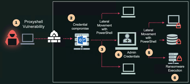服务帐户攻击示例 1:使用受感染的 Microsoft Exchange Server 服务帐户的勒索软件攻击模式