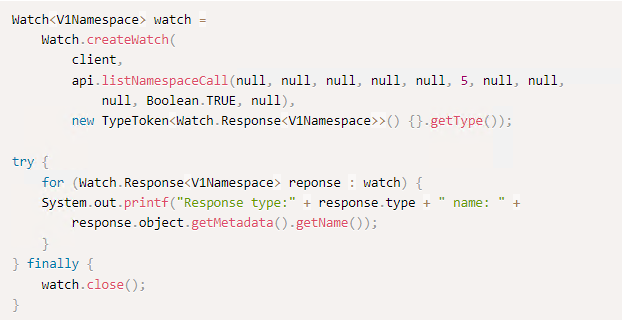 除了检索单个结果外,还可以通过将watch方法的参数设置为 来监视事件Boolean.TRUE。这相当于kubectl get <resource> -w命令。例如,要观察 a 中的变化namespace并打印它们: