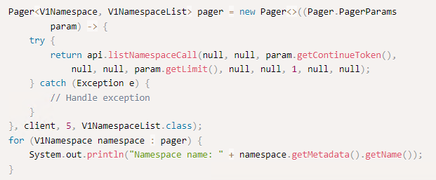 一个更高级的用例是列表请求的分页,它减少了服务器端负载和网络流量。例如,一次检索五个名称空间,而不是一次检索所有名称空间: