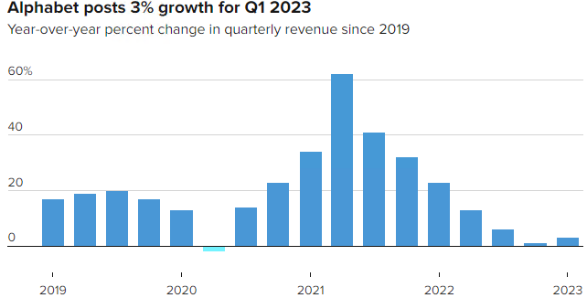 根据收益报告,Alphabet 的收入从一年前的 680 亿美元增长 3% 至 697.9 亿美元。在经历了近二十年的持续快速扩张之后,该公司陷入了连续多个季度的低个位数收入增长。自去年以来,由于对经济衰退的担忧加剧,广告商一直在削减在线营销预算,对谷歌、Facebook造成了严重破坏和别的。