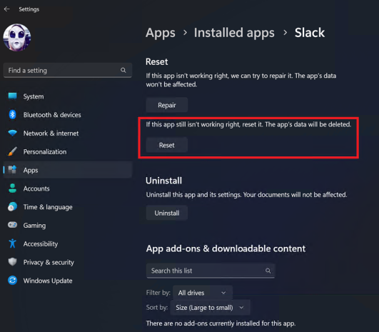 5. 注意有两个按钮,Repair 和 Reset。单击重置。